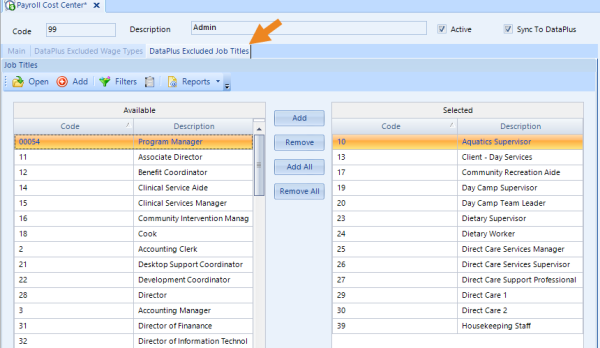 Select the DataPlus Excluded Job Titles tab to add (or remove) job titles that do not apply to this cost center.