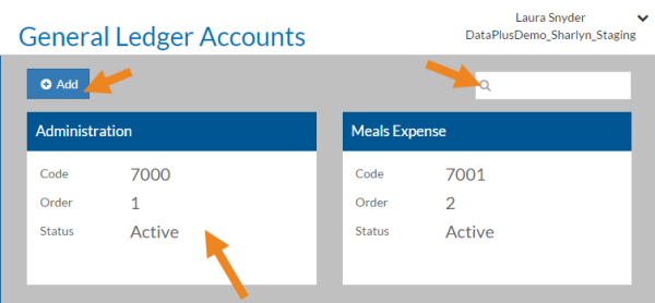 Select a General Ledger Account card from the list or enter a General Ledger Account in the Search box to search for a specific General Ledger Account.