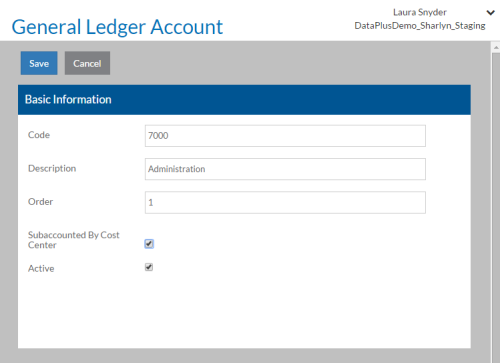 Description Enter a description of the General Ledger Account. Order The order you want the General Ledger Account to be sorted in lists. Subaccounted By Cost Center Select if this General Ledger Account has cost center subaccounts. Active Select if the General Ledger Account is "in use" and will appear in the list of choices.