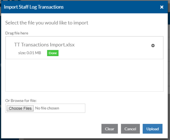 Step Results: The Import Staff Log Transactions pop-up opens.