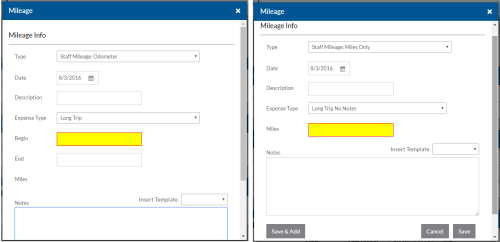 The expense type selected can change whether or not total miles or the beginning and ending odometer are required.