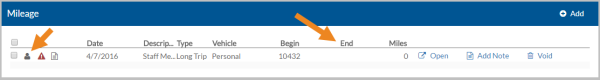 The person icon indicates that this is a Staff Mileage Log transaction, while the people icon indicates that it is a Mileage with Clients Log transaction. It will have an error flag, indicating that the transaction is open and does not have an end odometer reading recorded yet.