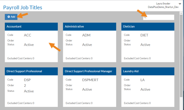 Select a Payroll Job Title card from the list, enter a Payroll Job Title in the Search box to search for a specific Payroll Job Title.