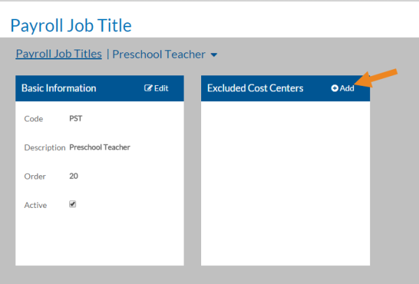- Select Add on the Excluded Cost Centers card to select any payroll cost center that would never apply to this Payroll Job Title.