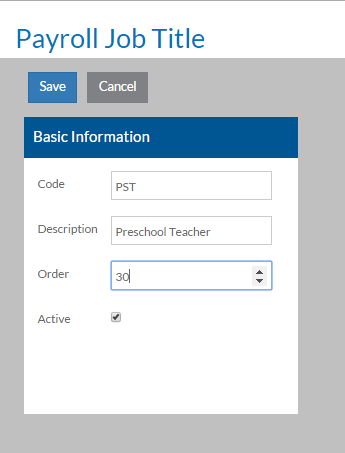 In this field: Enter: Code The code of the Payroll Job Title. Description A description of the Payroll Job Title. Order The order you want the Payroll Job Title to be sorted in lists. Active The Payroll Job Title is in use. Step Results: If this is a new Payroll Job Title, the Excluded Cost Centers card appears.