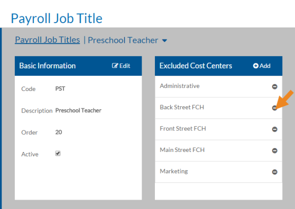 Select the minus sign next to a cost center to remove it from the this list of exclusions for this Payroll Job Title.
