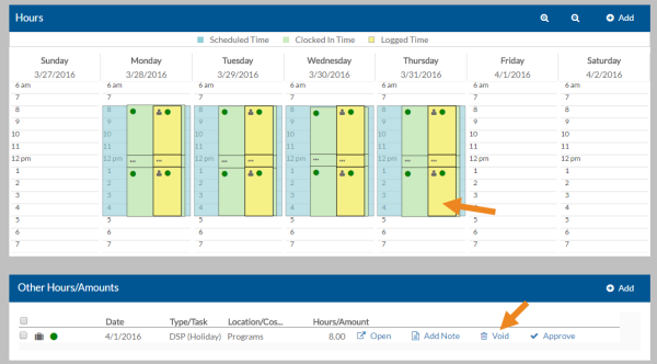 Select or tap a block on the Hours graph, select a row in one of the grids or click the Void (Unvoid) link next to the transaction in one of the grids (such as Other Hours/Amounts or Mileage).