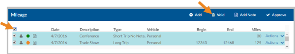 Step Results: If you were voiding the transactions, the trash can icon appears next to each of the transactions in the grid, the links changes to Unvoid and any notes will appear in the Notes area of the transactions. If you voided the transactions by mistake, select Unvoid to reset them.