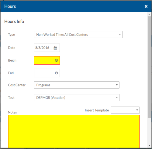 Record Staff Non-Worked Time Log transactions that require a begin and end time from the Hours graph.
