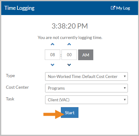 Select the begin time for your non-worked time from the Time Logging card.