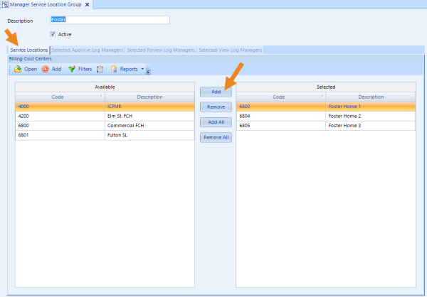 In the Service Locations many-to-many, add (or remove) the Billing Cost Centers to (or from) the Selected column that belong to this manager service location group.