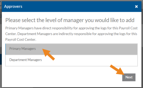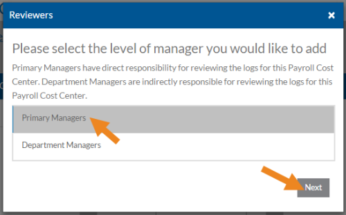 Important: Primary Managers have direct responsibility for approving the log entries for this Payroll Cost Center. Department Managers are indirectly responsible for approving the log entries for this Payroll Cost Center.