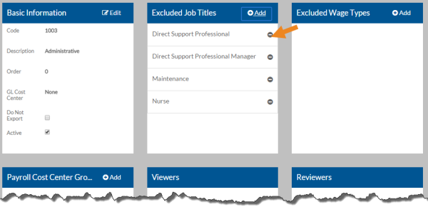 Select the minus sign next to a job title to remove it from the this list of exclusions for this Payroll Cost Center.
