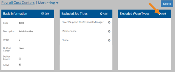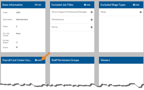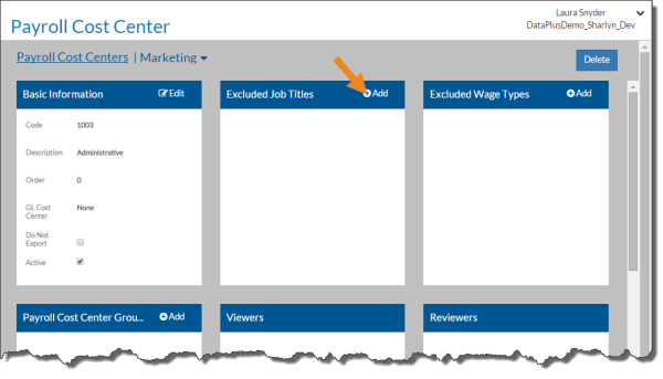 In this field: Enter: Code The code of the Payroll Cost Center. Description A description of the Payroll Cost Center. Order The order you want the Payroll Cost Center to be sorted in lists. GL Cost Center The associated General Ledger Cost Center. Do Not Export Select this option If you have some cost centers that are "live" and using Time Tracking and other cost centers that are in the "parallel" process, you may want to exclude the "parallel" cost centers from the export until they "go live." Active The Payroll Cost Center is in use. Step Results: If this is a new Payroll Cost Center, the Excluded Job Titles, Excluded Wage Types, Payroll Cost Center Groups, Viewers, Reviewers and Approvers cards appear.