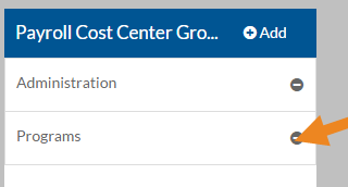 Select the minus sign next to a Payroll Cost Center Group to remove it from the list of Payroll Cost Center Groups for this Payroll Cost Center.