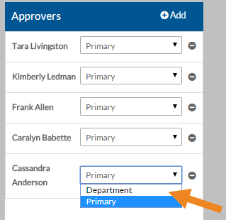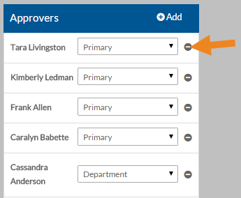 Select the minus sign next to an approver to remove him or her from the Payroll Cost Center.