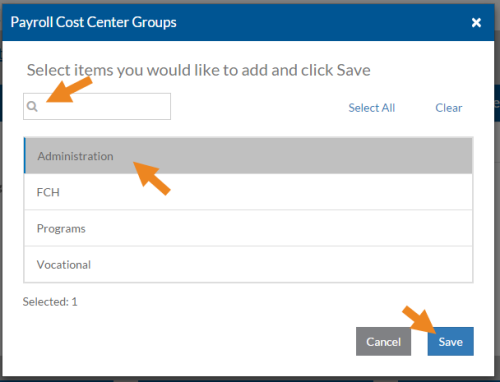 Select the Payroll Cost Center Groups you want to assign to this Payroll Cost Center and then click Save.