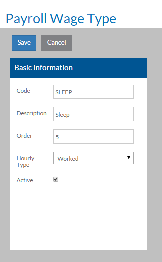 In this field: Enter: Code The code of the Payroll Wage Type. Description A description of the Payroll Wage Type. Order The order you want the Payroll Wage Type to be sorted in lists. Hourly Type - Amount: This wage type is a flat amount and is considered non-worked by default.
