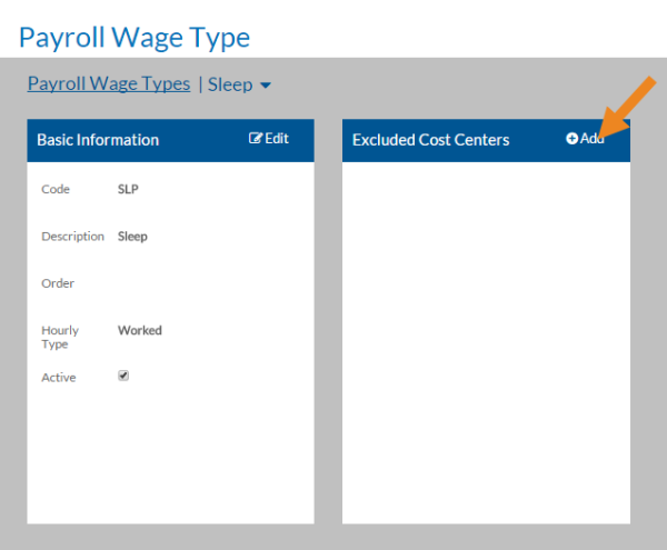- Select Add on the Excluded Cost Centers card to select any payroll cost center that would never apply to this Payroll Wage Type for data entry.