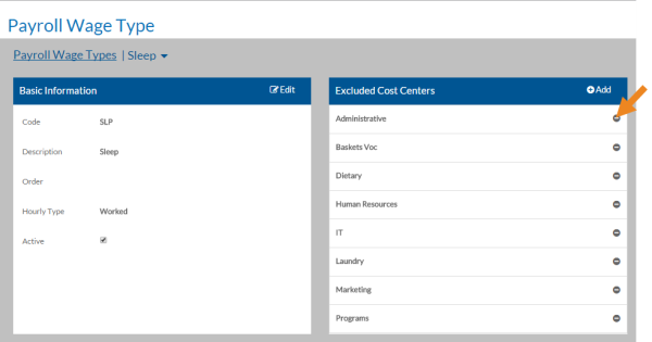 Select the minus sign next to a cost center to remove it from the this list of exclusions for this Payroll Wage Type.