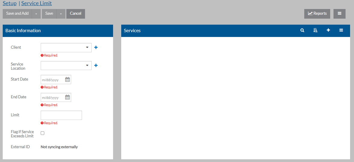 Field: Description: Client The name of the client the limit is for. Service The service that has the limit. Service Location If the service is only limited for a particular service location, select the service location. Otherwise, leave this field blank. Start Date The first date this limit begins. End Date The last date this limit is in effect. Limit The number of hours this client is authorized to receive of the selected service for the date range entered. Flag if Service Exceeds Limit If the Staff Permission Group is not set up to restrict staff from logging time for the client if they are over hours for this service, you can select this option to flag any log entries for this client/service/(service location, if entered) that are over the limit. External ID If the service limit was created from a contract detail limit, this read-only field will show the ID of the contract detail limit or global limit in ProviderPro. Otherwise, it will say “Not syncing externally.”
