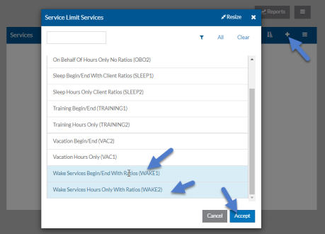 Select the + on the Services card, select the Services that apply to this limit and select Accept.