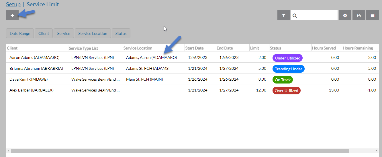 Select the + to add a new or select a row to open an existing service limit.