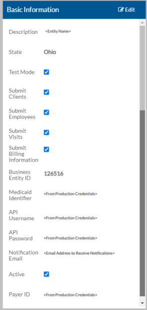 To get started you only need to enter the Description, the State and the Notification Email. You will not set up the OH Business Entity ID (Ohio only), OH Medicaid Identifier(Ohio only), API Username and API Password until after the testing phase is complete and you have received your production credentials from Sandata.