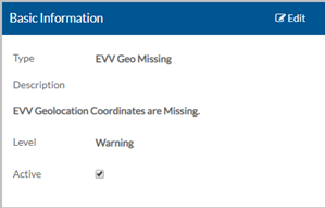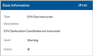 | This flag appears when the EVV geolocation coordinates are missing. This can be caused if location services were denied or turned off in the browser. | |