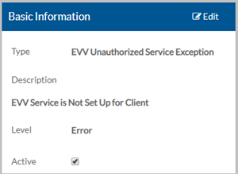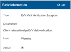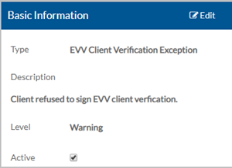 | This flag appears when the EVV service provided to this client is not set up for the client. Managers must change the service to one that is set up for this client or set it up for the client in order for the aggregator to accept the visit. | |