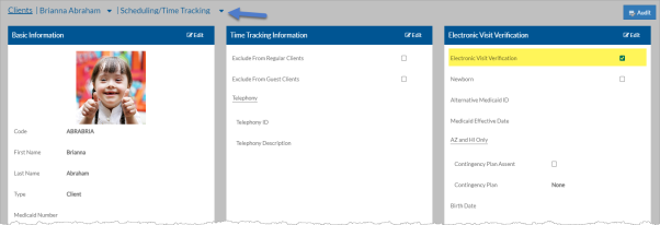 In addition, depending on your state’s EVV requirements you may also need to complete the information on the Electronic Visit Verification card found at the bottom of the Staff Scheduling/Time Tracking tab.