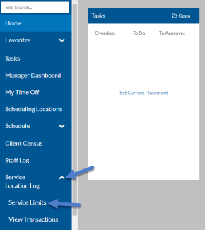 Select the arrow next to Service Location Log in the menu pane and select Service Limits.