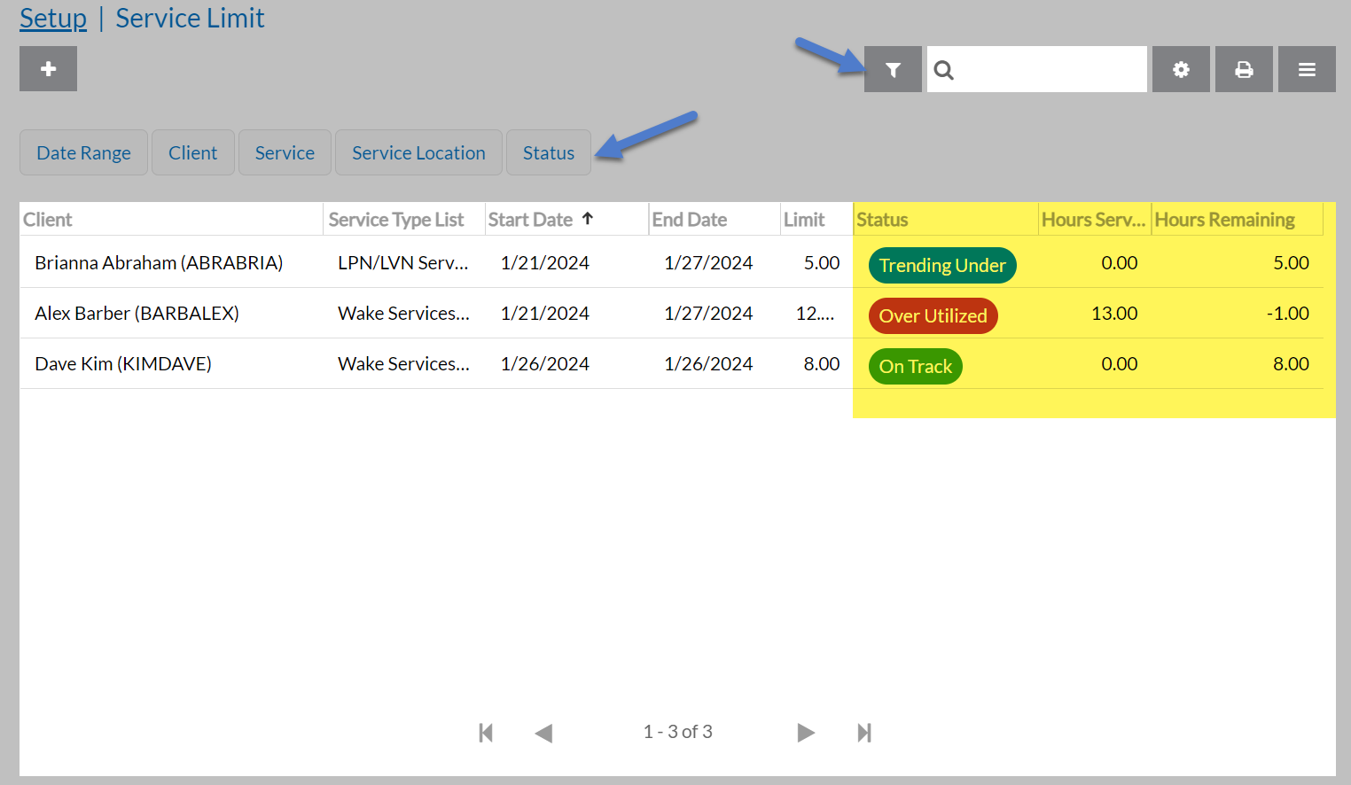 The administrator, service location approver, service location reviewer, and service location viewer can all view the status of the clients’ services limits as well as how many hours have been served and how many hours remain for the date range.