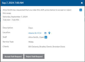 Click the Accept Sub Request to pick up the shift or Reject Sub Request to decline it.