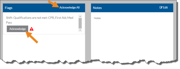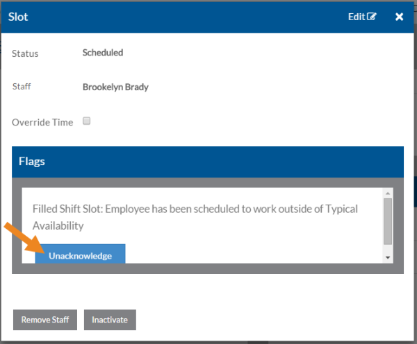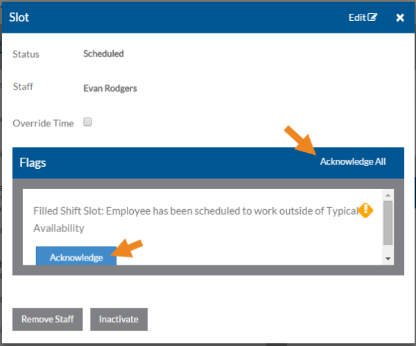 Schedule managers can a acknowledge a shift or employee (slot) flag from the shift or the slot with the flag.
