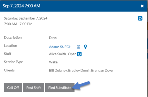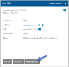 Select My Schedule from the menu or if the one you want to find a substitute for is your next shift, select Find Substitute on the Next Shift card on the Home screen.