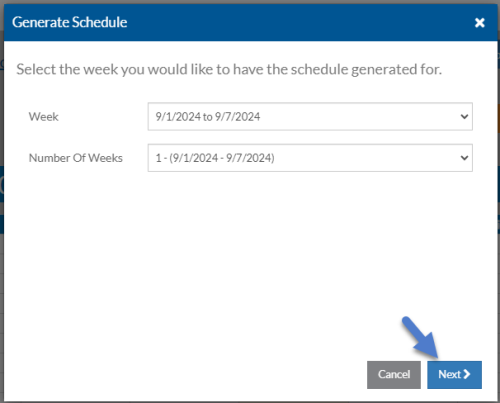 Select the first week you want to generate shifts for, the number of weeks you want to generate and click Next.