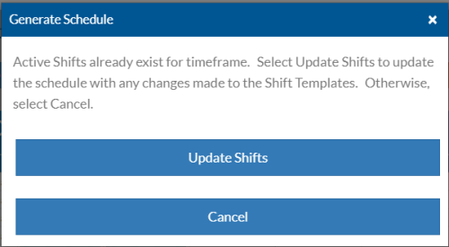 If the week you selected already has shifts and if you've made changes to the shift templates (new shifts or different staff assigned to shifts only), you will be prompted to Update Shifts to continue or Cancel to exit the utility.