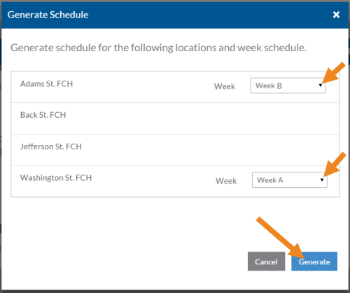 If any of the scheduling locations has a Weekly Cycle other than one, you can select which week in the cycle you want to generate for the first week you selected to generate. It will default to the correct week in the cycle based on the Week A Start Date of the scheduling location, but you can override it if needed.