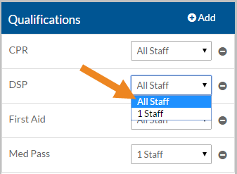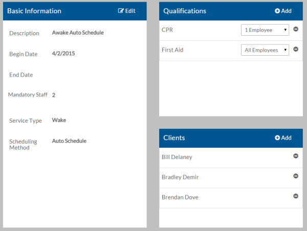 Step Results: The Qualifications cards appear with defaults from the scheduling location. If the scheduling location includes clients, then the Clients card also appears along with Client Qualifications card (read only) if any of the clients have special qualifications. You can make changes to the qualifications and clients as needed.