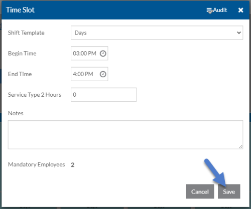 Select the appropriate Shift Template associated with this time slot, the Begin and End Time of the shift, the number of hours expected to be serving Service Type 2 (optional) as well as any related notes and click Save.