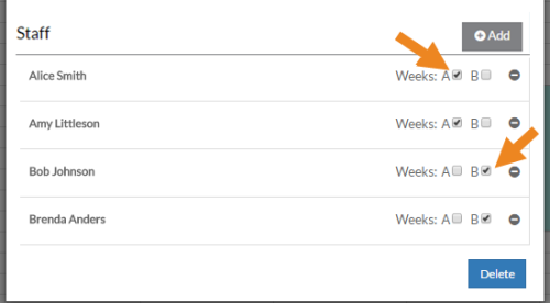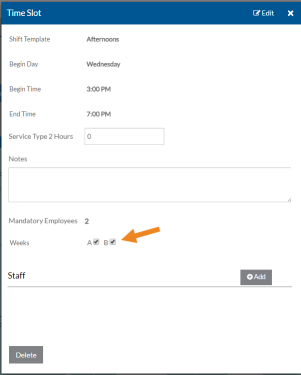 If the scheduling location's Weekly Cycle is not set to "1," then select or clear the check box for the correct Weeks (A, B, C, etc.) next to each staff to indicate which week the staff is assigned to that shift.