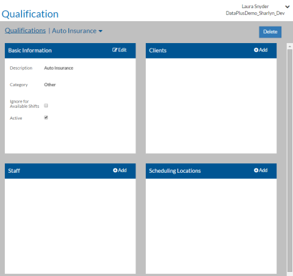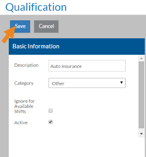 In this field: Enter: Description A Description of the Qualification. Category The desired user-defined Qualification Category. Ignore for Available Shifts If an open or posted shift requires this qualification, the shift will still appear under Available Shifts for staff even if he or she does not have the qualification. Active The Qualification is in use. Step Results: If this is a new qualification, the Clients, Scheduling Locations and Staff cards appear.