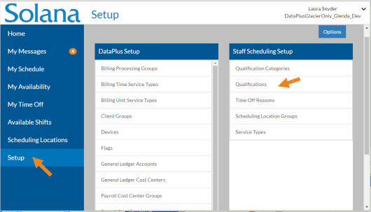 Select Setup on the menu and then select Qualifications on the Staff Scheduling Setup card.