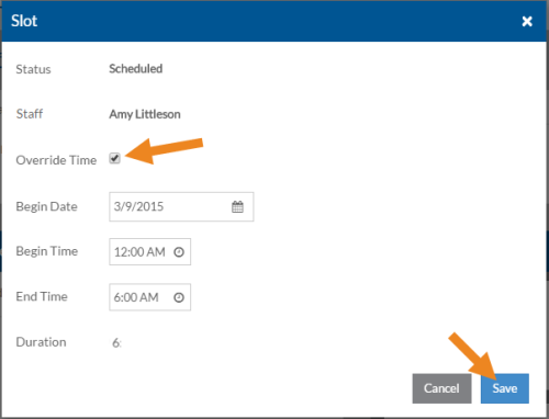 Select the Override Time check box, change the Begin/End Times as needed, and click Save.