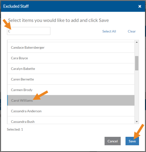 - Select the staff that the client wants to exclude from working with them and then click Save.