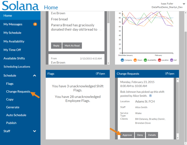 Select Change Requests under Schedule in the menu or select Approve or Deny on the Change Requests card for the request on the Home screen.