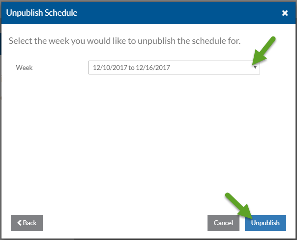 - Select the scheduling location(s) that you want to unpublish shifts for and select Next.