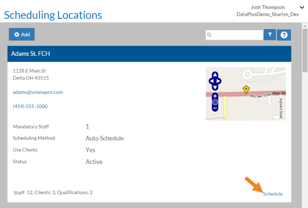 Select Scheduling Locations from the menu and then enter the name of the scheduling location in the Search box.