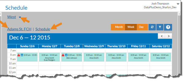 - Select the Week, Day, Month and List filters above any of the schedules to change the view of all the schedules.